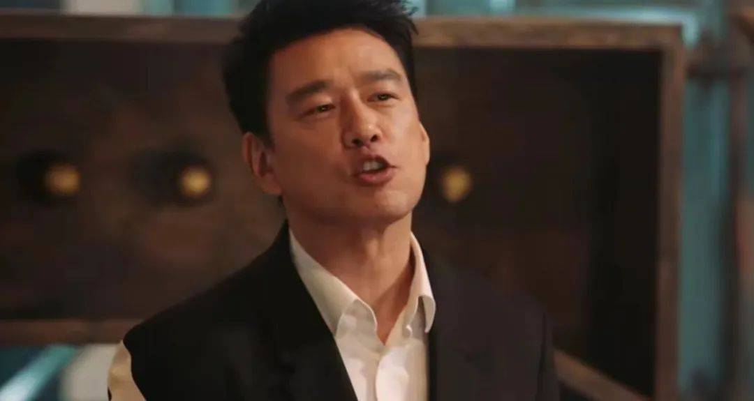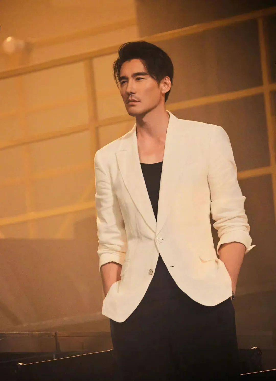 郑嘉颖穿着深V内搭与黑色西装,就算是远景,也能看出他的身材保持得很好。