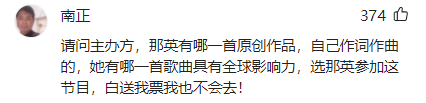 请问主办方,那英有哪一首原创作品,自己作词作曲的,她有哪一首歌曲具有全球影响力,选那英参加这节目,白送我票我也不会去!