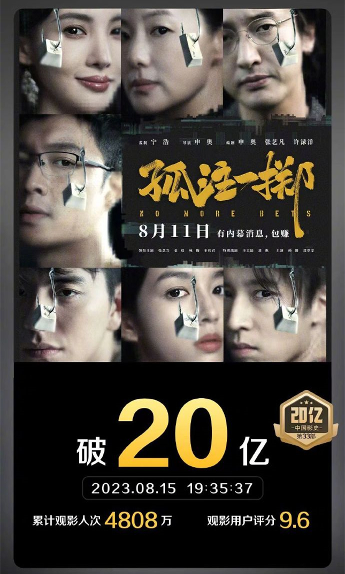 据媒体公布的实时数据显示,截至8月15日19时35分,影片《孤注一掷》票房突破20亿,成为中国影史第33部破20亿票房的电影。