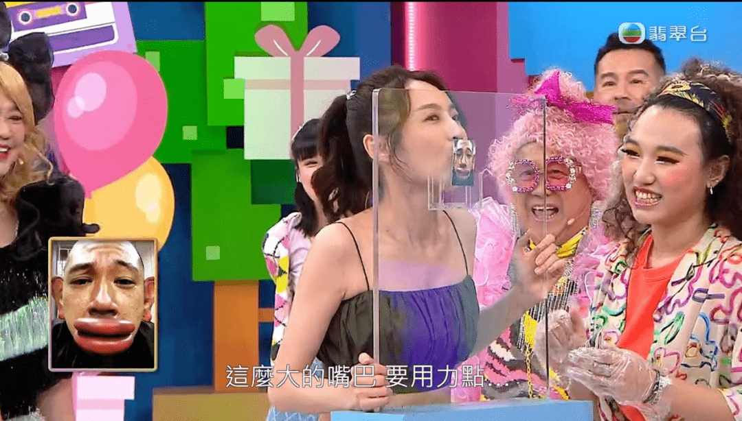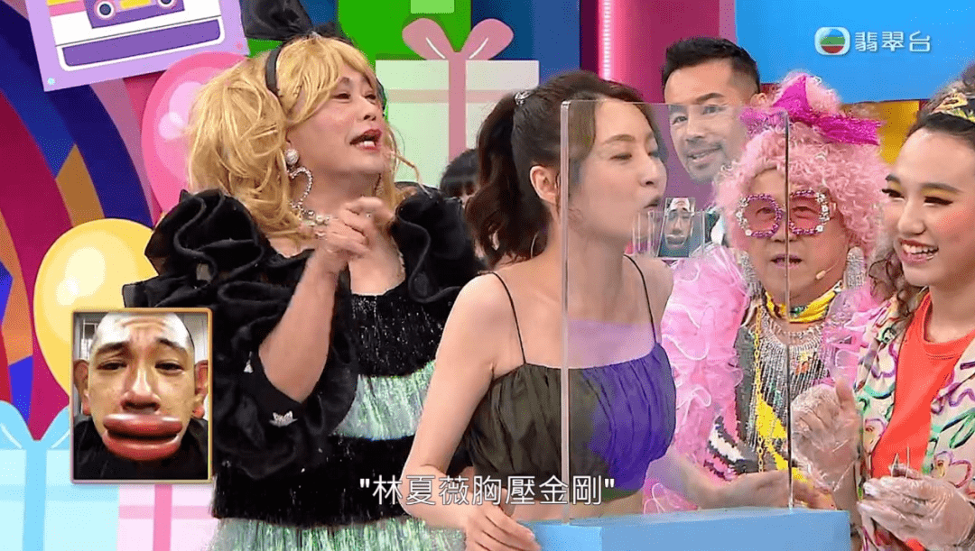 第一个游戏是开心无敌传紫菜,除了传紫菜之外增加了难度,用奖老和嘉宾们的照片代替紫菜。怎料,第一棒林夏薇吸金刚的厚嘴唇照片时,就闹出了笑话。正当林夏薇望着金刚的大嘴巴照片,要吸下去的时候,阮兆祥就突然爆了一句:林夏薇做这么久戏都好难投入。