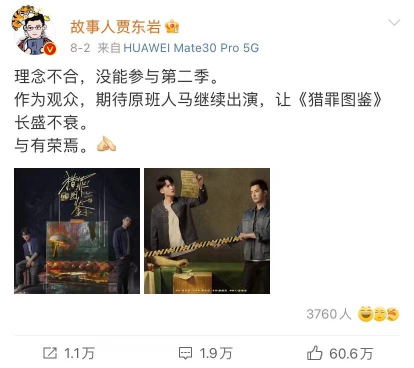 原标题:编剧贾东岩退出《猎罪图鉴2》:不清楚加没加女主,可能会和檀健次合作正剧