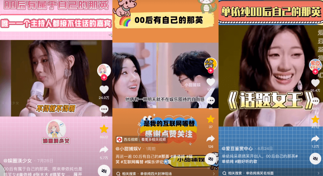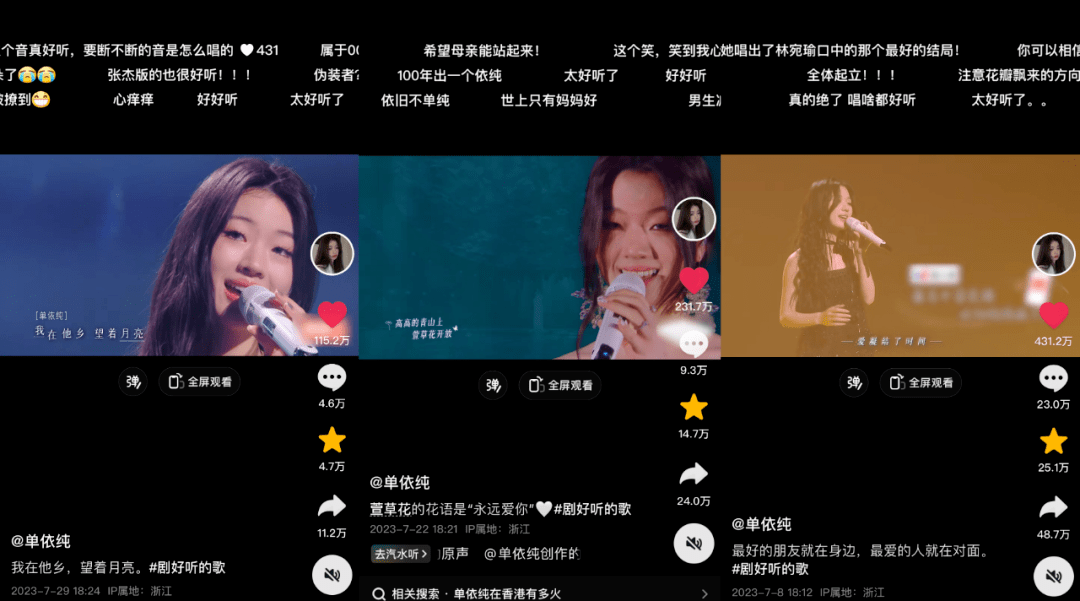 《我要你》115.2w、《萱草花》231.7w、《爱的回归线》431.2w,最近单依纯官抖号三个翻唱视频连破百万赞,两度登顶抖音娱乐榜TOP1,这位00后女唱将展现出超越年龄的唱商天赋,令网友们直呼华语乐坛“后继有人”。