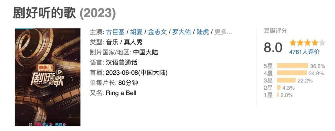 这或可解释为何《剧好听的歌》上线后从豆瓣开分7.5一路上涨至8分,且节目各方讨论助推微博总话题阅读量破60亿、热搜合计671个;短视频7支视频点赞破百万,热搜热榜合计326个,抖音爆款121条,单期爆款36个,最高点赞400w …… 因为这档打开了不同世代国人“泪腺开关”的音综真正做到了: