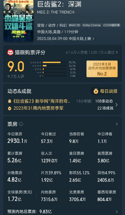 原标题:《巨齿鲨2》预测票房跌破10亿 主演又投资的吴京值不值?