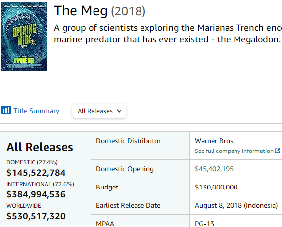 《巨齿鲨》在2018年上映,中国票房10.53亿元,全球卖了5.305亿美元。这部电影的成本是1.3亿美元,成为为数不多的赚钱的合拍片。
