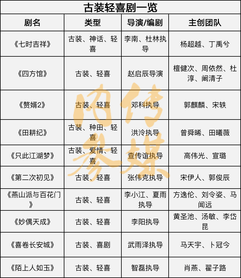 据不完全统计,目前待播的古装轻喜剧达10部以上,重点剧集包括由郭麒麟、宋轶主演的《赘婿2》,檀健次、周依然、杜淳、阚清子主演的《四方馆》,杨超越、丁禹兮主演的《七时吉祥》,曾舜晞、田曦薇主演的《田耕纪》等。