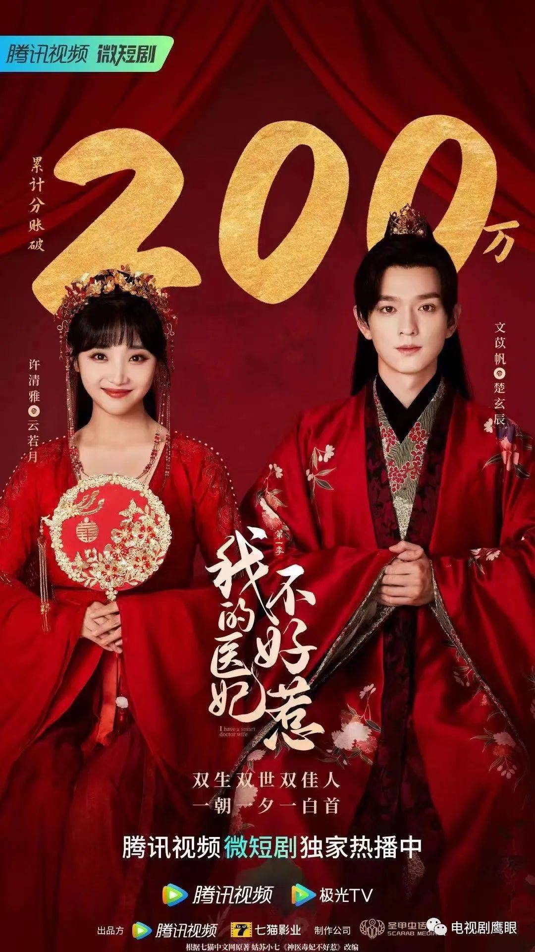 七猫首部自制网络剧《我的医妃不好惹》,改编自七猫中文网姑苏小七的代表作《神医毒妃不好惹》,由腾讯视频、七猫影业出品,刘沐晗担纲总制片人、赵玉铎担任制片人、傅闱玮导演,许清雅、文苡帆等主演的甜宠剧。从剧集上线已累计分账300万!
