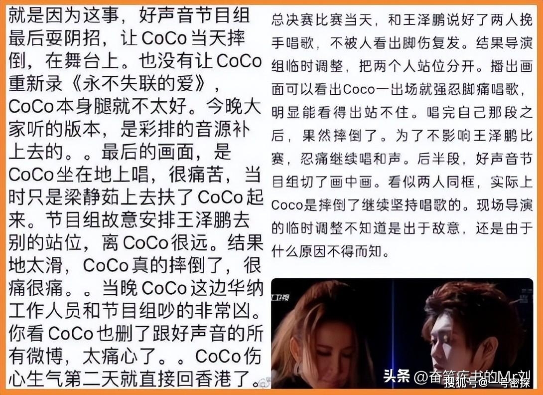据说在李玟事件发生后,节目组还曾在导师学员合作环节中不顾李玟有缺陷的腿,坚决不让学员和她在台上并肩互动。