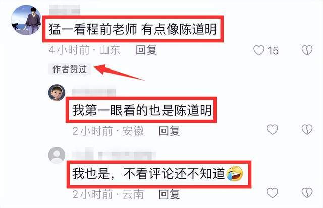 更有不少网友把程前看成了陈道明,猛一看确实有些神似陈道明,尤其气质都很儒雅,连李秀媛都点赞了网友说程前像陈道明的评论,想必她也认为两人长得有些像吧。