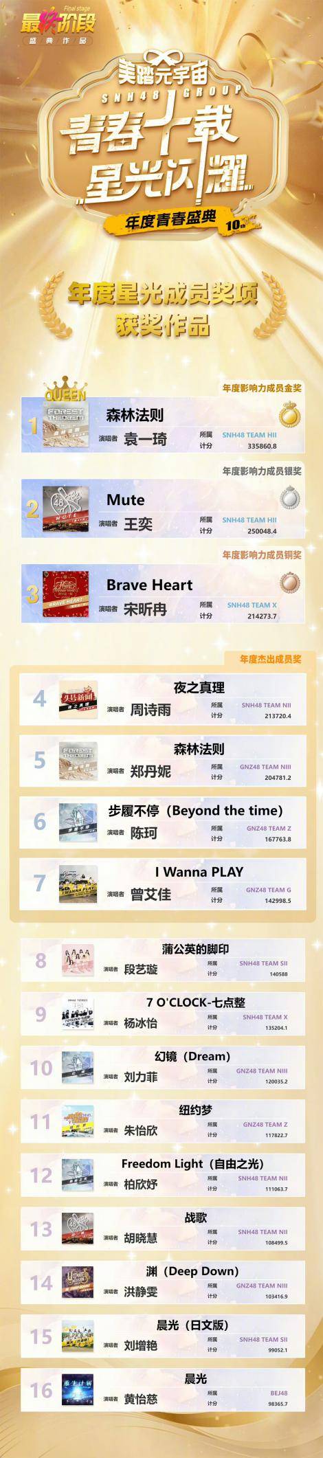 在十周年演唱会之外,秉持着一贯鼓励优秀作品,重视艺能成长的理念,当晚的盛典现场还挖掘和表彰了一批年度优秀作品。最终,SNH48袁一琦的作品《森林法则》获得年度影响力成员金奖及年度巅峰人气QUEEN荣誉。SNH48王奕的作品《Mute》、SNH48宋昕冉的作品《Brave Heart》分获年度影响力成员银奖和铜奖,由SNH48周诗雨、GNZ48郑丹妮、GNZ48陈珂、GNZ48曾艾佳演唱的作品《夜之真理》、《森林法则》、《步履不停》、《I Wanna PLAY》分获年度杰出成员奖项,其他专业类别、人气类别作品奖项也各有归属。