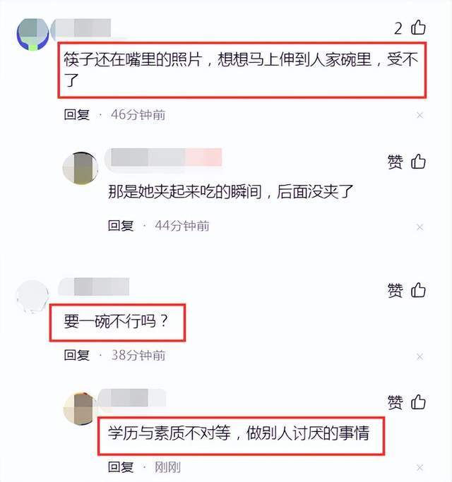 这个意见挺好,一碗豆花面又花不了多少钱,而且李雪琴也不差钱,尤其是看到筷子还在李雪琴嘴里,一会她又拿着筷子伸到别人的碗里,接受不了这种行为,有网友表示学历和素质不对等。