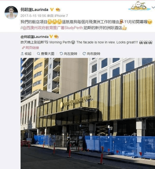 令人惊叹的是,何超莲在年仅26岁时就靠着自身的知识储备和独特的人生经验,完成了一项大型项目。2017年,她公开宣布自己投资的澳洲洲际酒店即将启业。