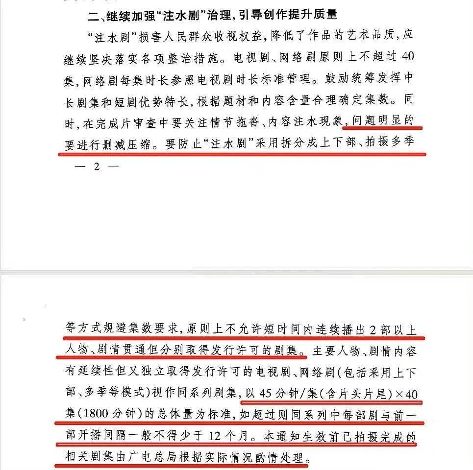 搜狐娱乐讯 8月3日,广电总局最新文件发布,其中规定加强整治注水剧:防止注水剧采用拆分成上下部、拍摄多季等方式规避集数要求,原则上不允许短时间内连续播出2部以上人物、剧情贯通但分别取得发行许可证的剧集,以45分钟/集x40集(1800分钟)的总体量为标准,如超过则同系列中每部剧与前一部开播间隔一般不得少于12个月。