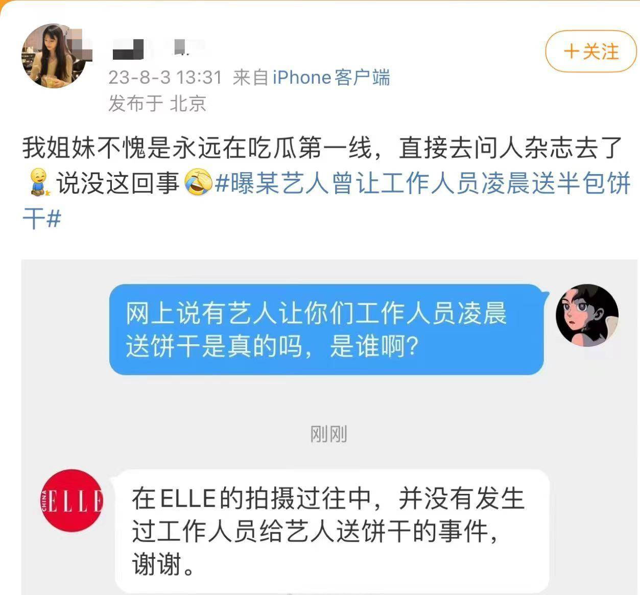 原标题:ELLE否认工作人员给艺人凌晨送饼干:没有发生过
