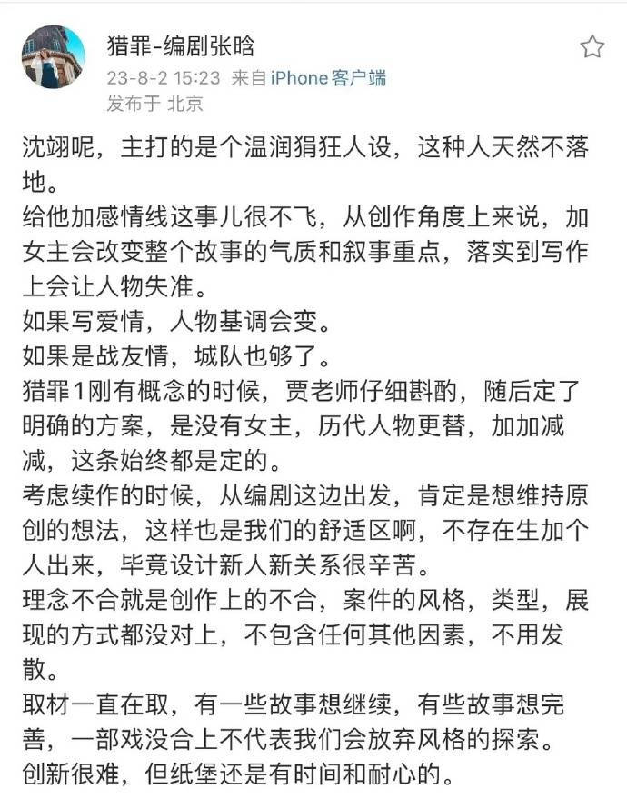 原标题:《猎罪图鉴》编剧再回应 称女主不是编剧想要加的