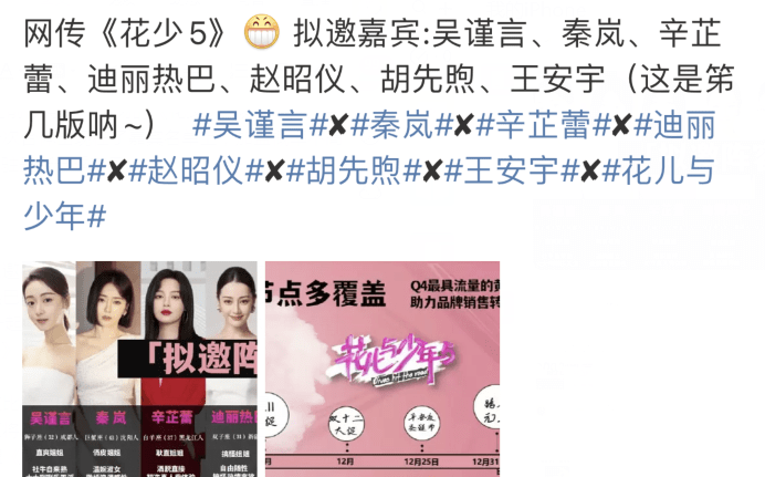 8月1日,之前传得沸沸扬扬的《花少5》拟邀阵容出变故,秦岚、吴谨言继《延禧攻略》后又一次合体出现在了嘉宾名单上,加盟概率不高的迪丽热巴被传已经与节目组签约,会常驻最新一季节目。