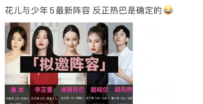 按照网传消息,《花少5》拟邀明星一共7位,分别是惠英红、闫妮、迪丽热巴、徐娇、邓恩熙、张一山以及刘耀文,既有咖位比较高的老戏骨镇场子,又有炙手可热的小花、小鲜肉加盟,配置与上一季类似,虽然豪华,但要同时齐聚这么多鲜少参加综艺录制的明星,可行性其实并不高。