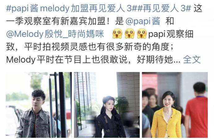 只不过同样敢说的郭采洁这季退出了,转而加盟的是papi酱以及melody,papi酱因为短视频而出名,但其本身学历高,她与老公的新型婚姻观也受到了很多年轻人的赞同。这次继《明星大侦探》后,她有加盟了芒果台综艺《再见爱人》,相信一向言辞犀利的她表现一定不错。