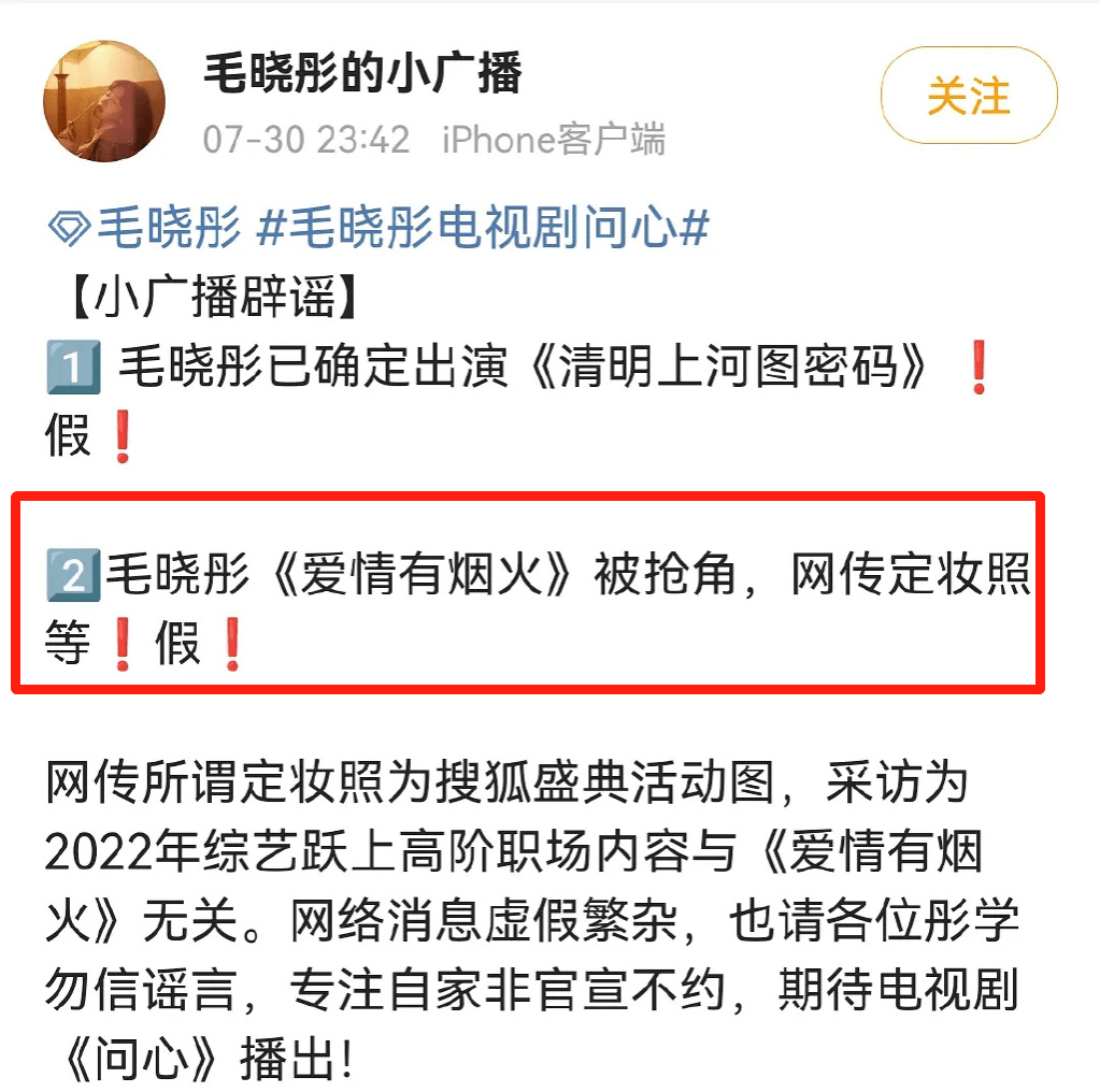 原标题:毛晓彤方辟谣《爱情有烟火》被王楚然抢角:网传为假!