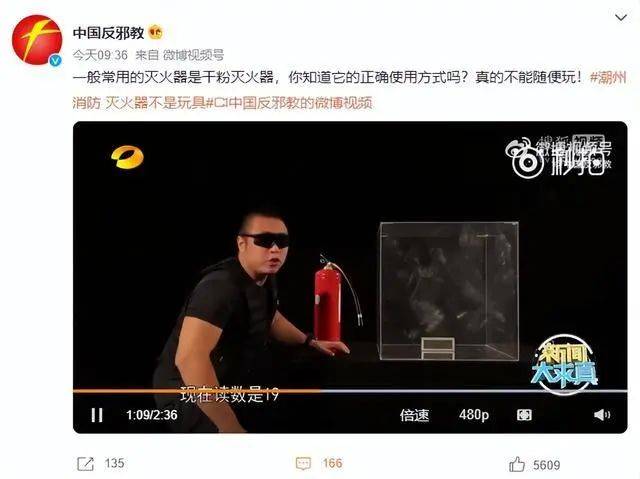 中国反邪教发视频科普,称“一般常用的灭火器是干粉灭火器,真的不能随便玩!”