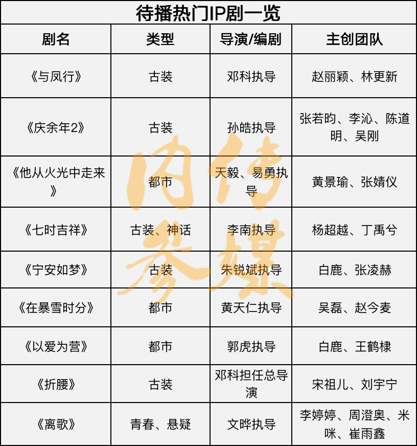 据不完全统计,目前待播的热门IP剧达9部以上,重点剧集包括由张若昀、李沁主演的《庆余年2》,赵丽颖、林更新主演的《与凤行》,吴磊、赵今麦主演的《在暴雪时分》等,涵盖古装、都市、青春等题材。