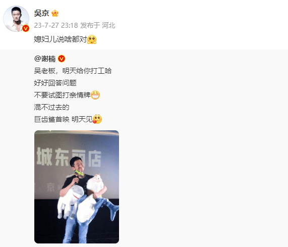 搜狐娱乐讯 7月27日,谢娜发文透露自己将主持吴京新片《巨齿鲨2》的首映礼,喊话老公吴京:“好好回答问题,不要试图打亲情牌,混不过去的。”随后,吴京回应:“媳妇儿说啥都对!”网友纷纷表示被甜到了!