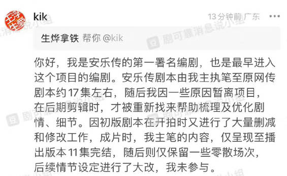 搜狐娱乐讯 近日,《安乐传》主角戏份在粉丝间引起一些争议。7月27日,一位自称《安乐传》第一署名的编剧现身回复网友,称剧本由她主执笔至原网传剧本约17集左右,初版剧本在开拍时又进行了大量删减和修改工作。成片时,该编剧主笔的内容,仅呈现至播出版本11集完结,随后则仅保留一些零散场次,后续情节设定进行了大改,她未参与。