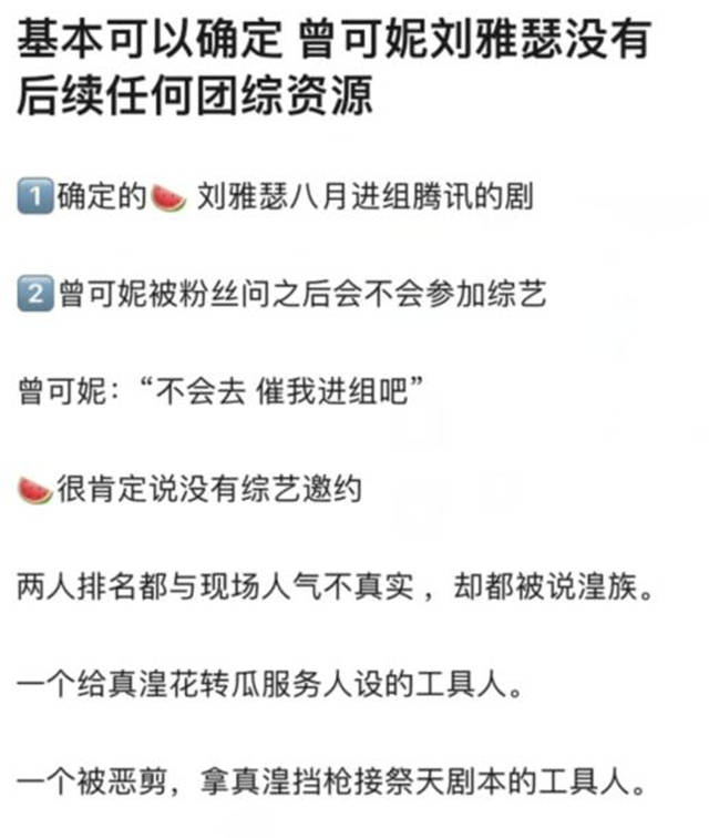 在节目播出后,曾有刘雅瑟和曾可妮的粉丝在网上发帖表示刘雅瑟、曾可妮在节目结束后没有任何团综的资源,刘雅瑟八月可能会有企鹅的剧进组,而曾可妮在被问到会不会参加综艺时,直接表示不会去,还是催进组吧。两人之前确实都曾有被传是皇族的时候,但结束后的红利却几乎没有太多。
