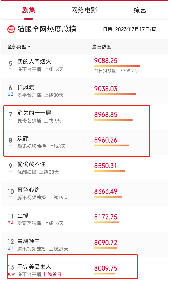 从平台7月17日的热度排名来看,,《消失的十一层》和《欢颜》排在第七、第八位,首日开播的《不完美受害人》竟然排到了第13位,连前十都没进去。