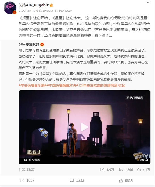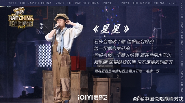 2022年一席之地联盟夺冠,2023年,一席之地联盟重组,VaVa毛衍七、艾热AIR、早安、杨和苏KeyNG、黄旭BooM五人并肩作战。四轮比赛定胜负,第一轮早安的舞台《星星》,有人文情怀的反战题材,形式上是说唱 音乐剧的创意融合,极具情绪感染力和舞台张力的演绎表达,《星星》带来的不仅有震撼还有感动。网友好评如潮“这种舞台还是第一次见”“说唱音乐剧的结合,很有创意”“这次的舞台很震撼” “鸡皮疙瘩起了”“眼泪停不下来” “会讲故事的”“泪目了”。在表演过程中,早安还意外受伤导致头部流血,但仍秉着专业的态度和职业精神继续演唱,确保了舞台的完整度。