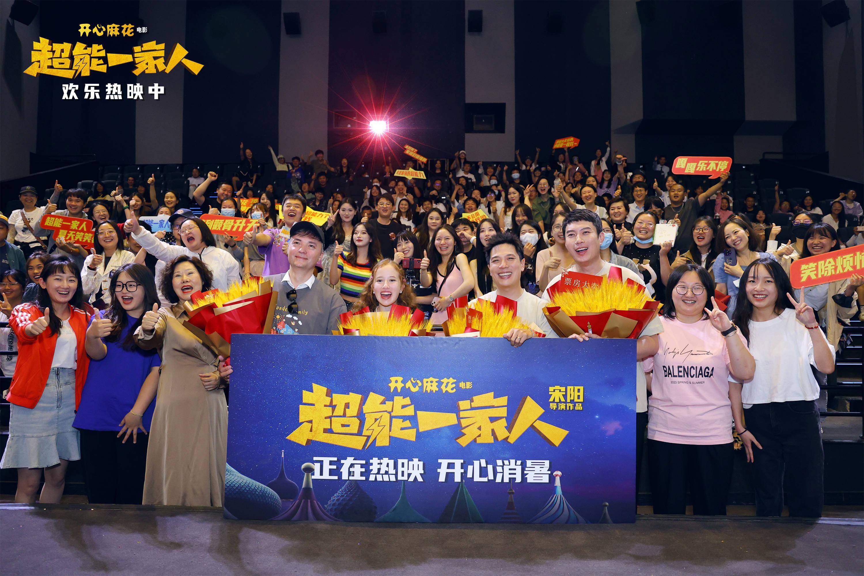 由宋阳执导,艾伦、沈腾、陶慧、张琪、韩彦博、白丽娜主演的开心麻花奇幻喜剧《超能一家人》正在热映中,截止目前,票房累计突破2.4亿。昨日,电影“超能送快乐,从北笑到南”全国路演,主创导演宋阳,主演艾伦、白丽娜、安德烈·拉泽夫来到了春城昆明与观众们面对面交流,并入座观众席和大家一起观看了电影。映后互动中,昆明观众们用方言“太板扎了”点赞电影的“解压”功效,也表达了自己的观影感受。面对观众们的声音,导演宋阳也坦言,“今天和大家一起看电影,可以静静观察每一位观众的即时反应,这对于我们以后的创作有很大的帮助,观众的反馈是我们认真努力去对待每一部作品的动力源泉”。