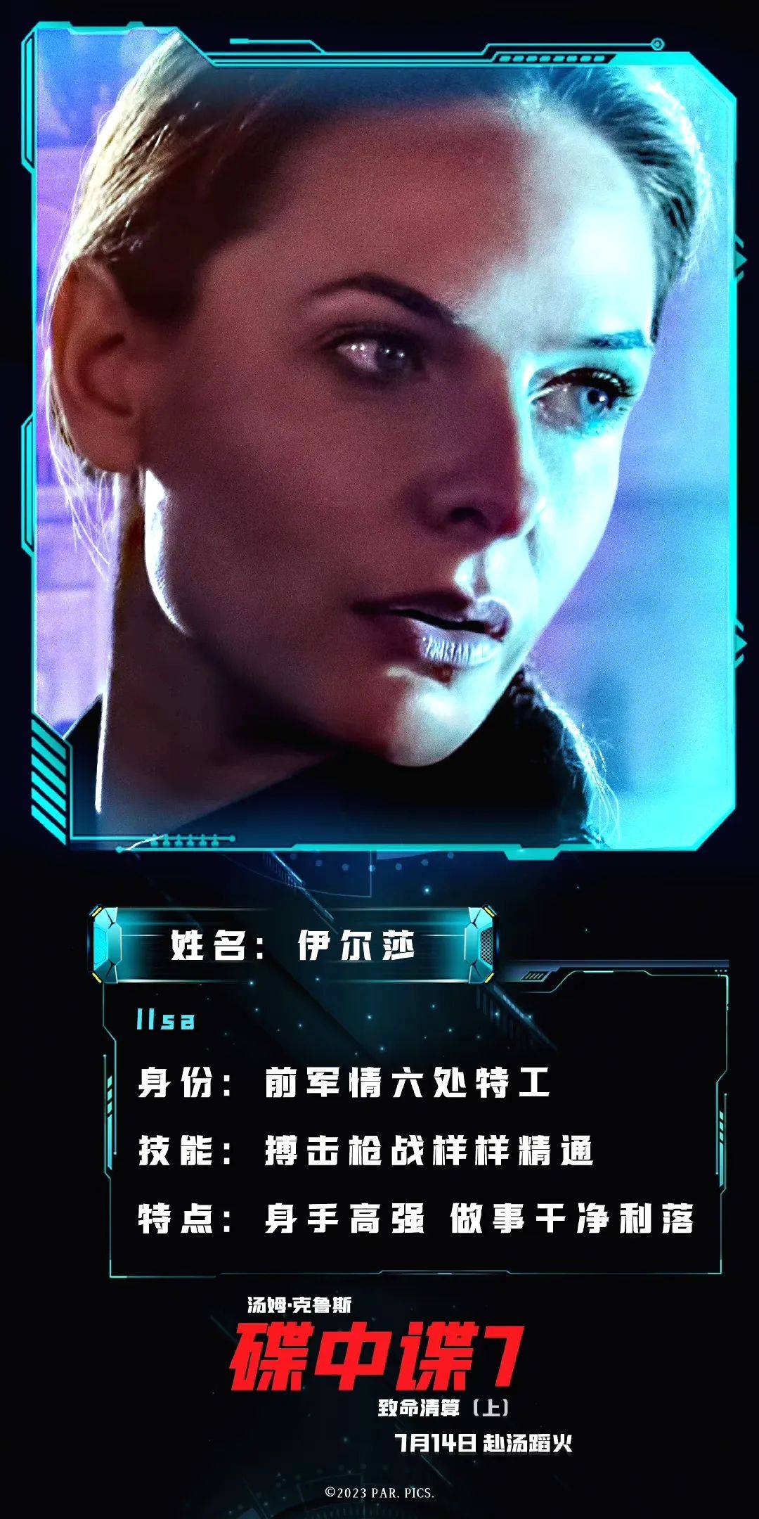 瑞典女星丽贝卡·弗格森饰演伊尔莎,从《碟中谍5》开始就是女一号,她是前军情六处的特工,搏击枪战样样精通,身手高强,做事干净利落。