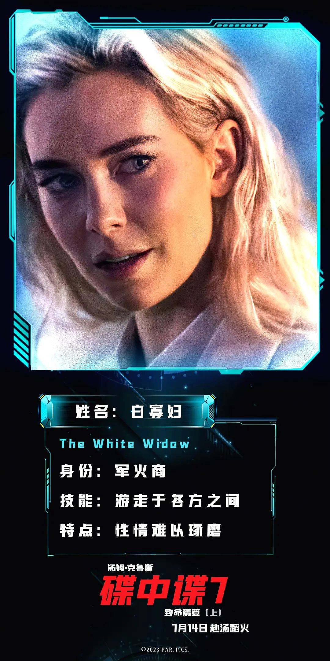 凡妮莎·柯比饰演的白寡妇,从《碟中谍6》就靓丽登场,被男主角给骗了。她这次卷土重来,身为军火商,这位美女游走于各方之间,性情难以琢磨。