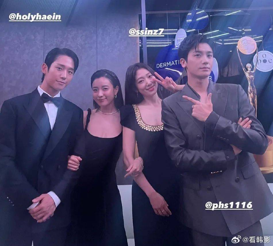 韩孝周、丁海寅、朴信惠、朴炯植在青龙电视大赏后台合影,梦幻联动!