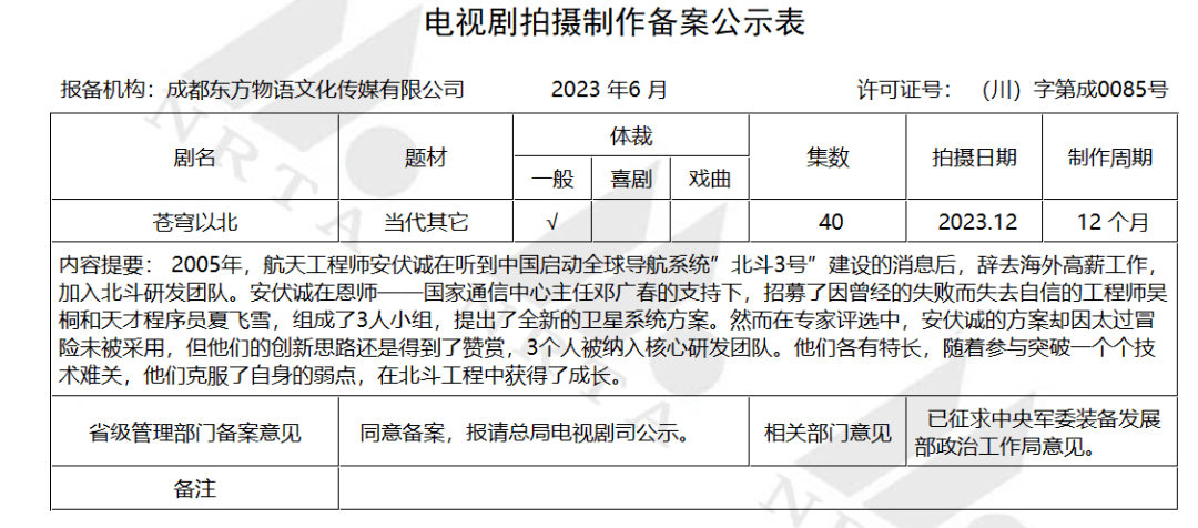 以四川为例,6月份备案了6部新剧,是近20个月以来数量最多的一次。其中,展示北斗导航系统30年研发历程的科技强国题材电视剧《苍穹以北》原本由上海慈文影视于2020年备案,许可证号为(沪)字第377号,现在则变更为成都东方物语文化传媒有限公司,许可证号为(川)字第成0085号。