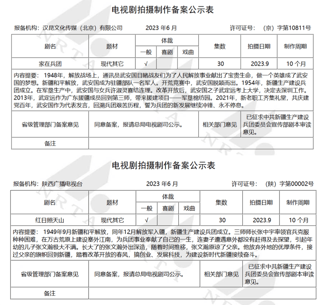 备案新剧中,罕见地出现了两部新疆题材:《家在兵团》和《红日照天山》。从故事梗概来看,《家在兵团》的时间跨度较大,从解放新疆一直写到新时代;《红日照天山》从解放新疆写到改革开放。
