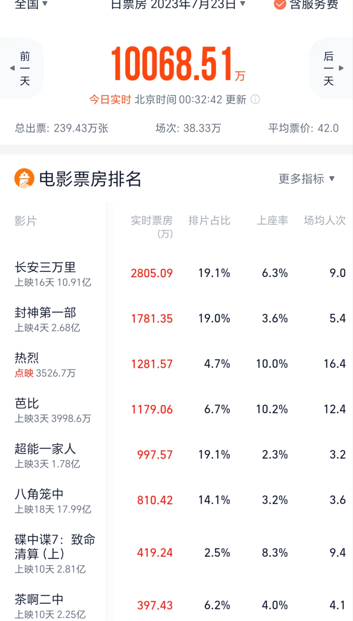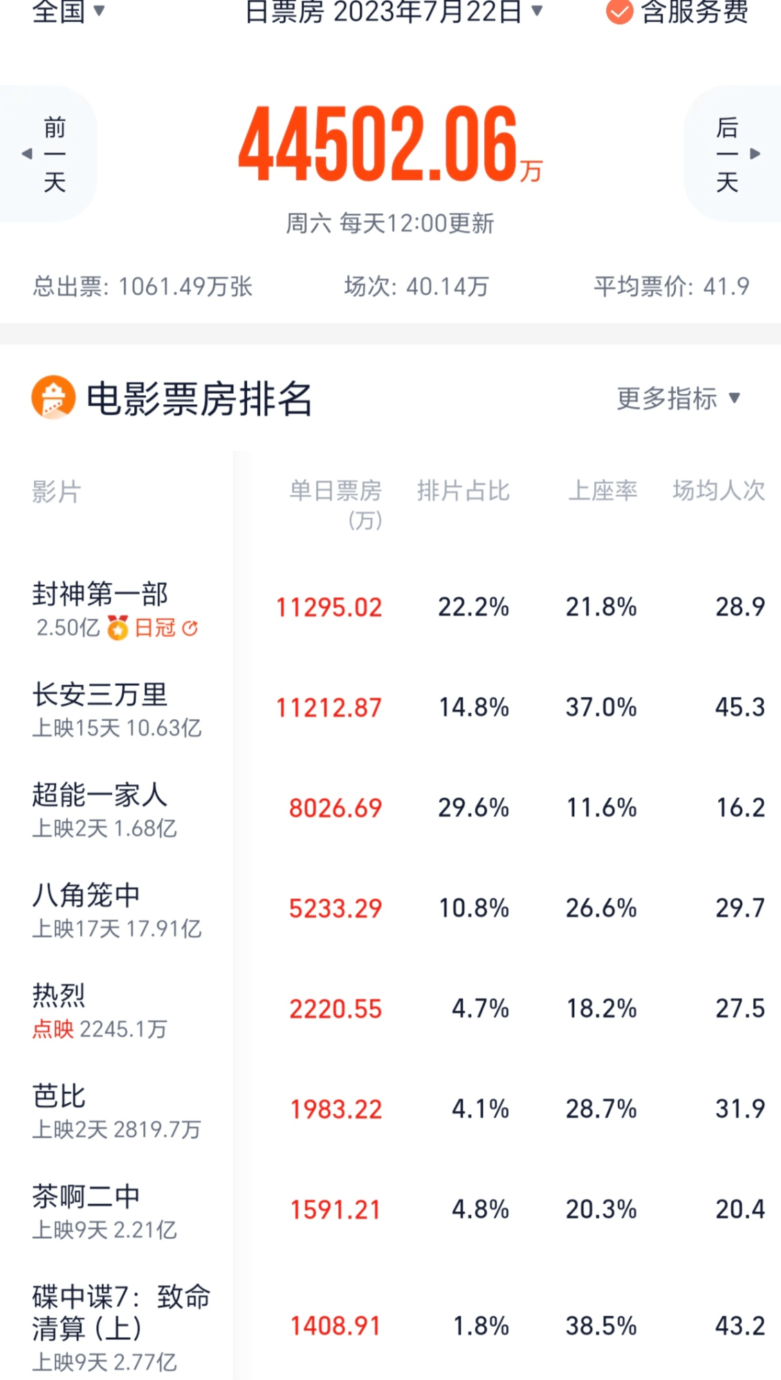 不过,这部片表现也不算强,排片在掉,上座率不如《碟中谍7》《长安三万里》《芭比》《八角笼中》,因为口碑还不错,正在蓄力。
