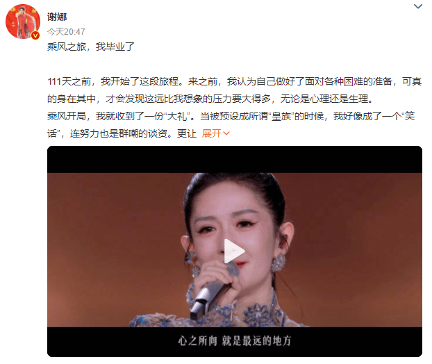 现在,请允许我再一次介绍自己:我是出道27年的谢娜,乘风之旅有时候很像人生,不可能一直一帆风顺,但我从来不会放弃希望,心之所向就是最远的地方,我会一直记得这个有笑有泪有汗水有泪水的热血夏天,谢谢你们的每一句鼓励,我们,不说再见就会再见!