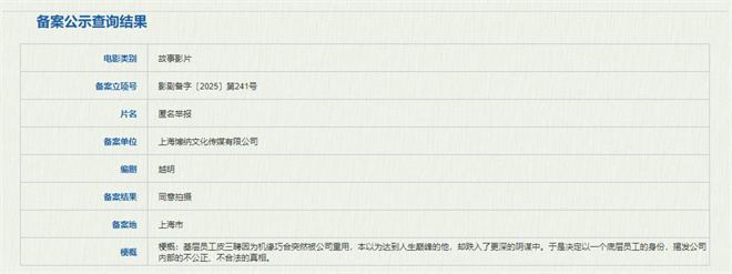 2月17日,国家电影局发布关于2025年1月上全国电影剧本(梗概)备案、立项公示的通知。由越明担任编剧的电影《匿名举报》备案立项,备案单位为上海博纳文化传媒有限公司。