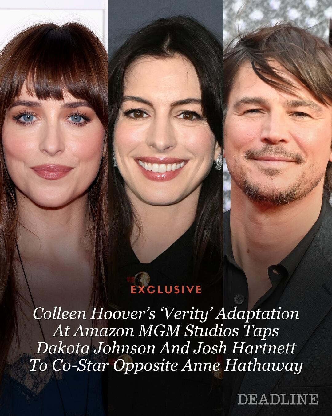 据外媒报道,安妮·海瑟薇正在运作的其中一部新片《不存在的罪人》(Verity)追加“达妹”达科塔·约翰逊、乔什·哈奈特主演。影片根据“美国短视频网站小说王者”科琳·胡佛(《爱情,到此为止》)的同名畅销悬疑爱情小说改编,由《对你的想象》导演迈克尔·肖沃特执导,尼克·安托斯卡撰写剧本。达妹饰演洛温,哈奈特饰演海瑟薇的丈夫杰瑞米。