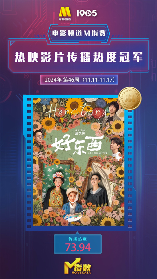 “电影频道M指数”2024年第46周结果发布。11月11日-11月17日,“电影频道M指数”热映影片传播热度榜前6位依次为: